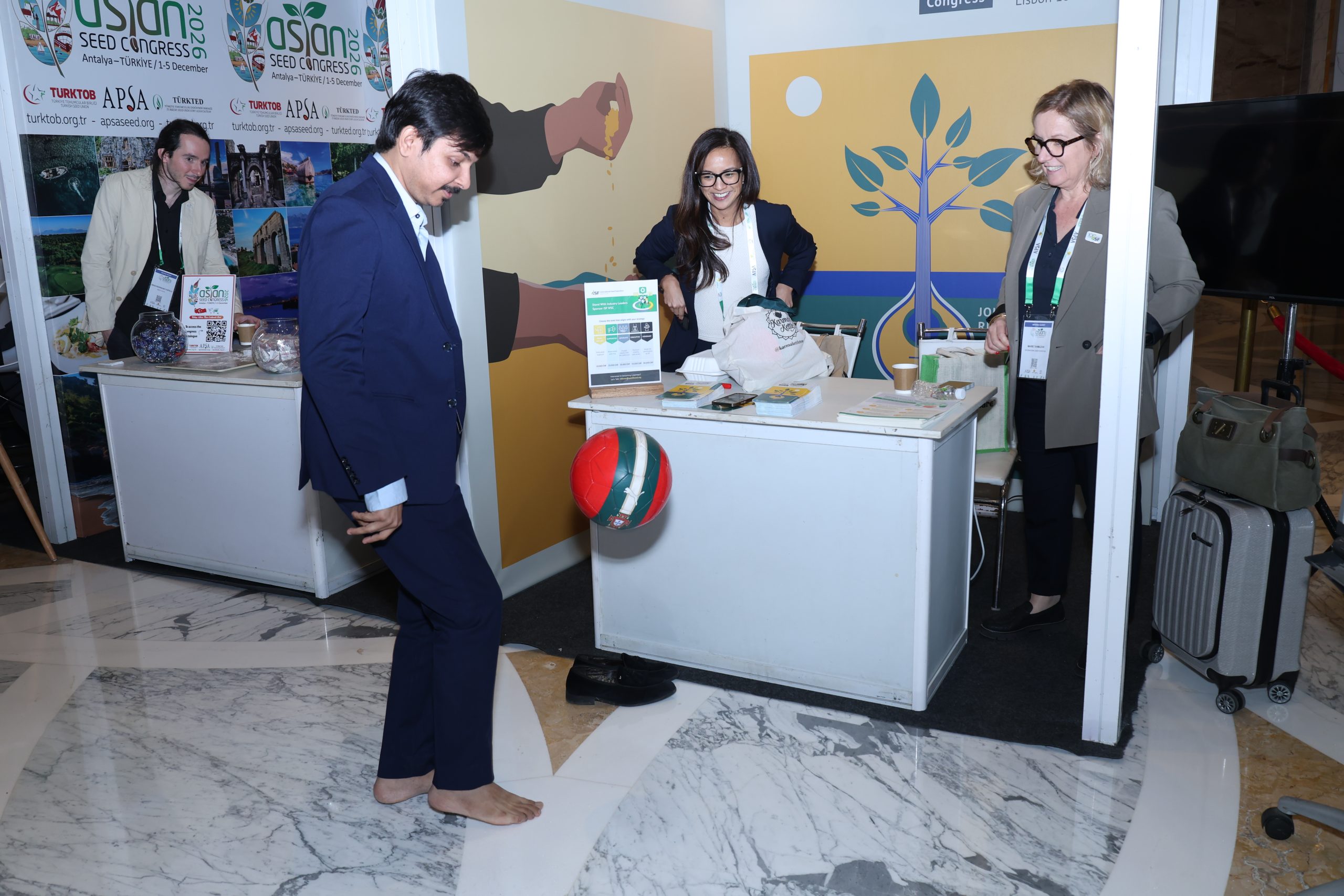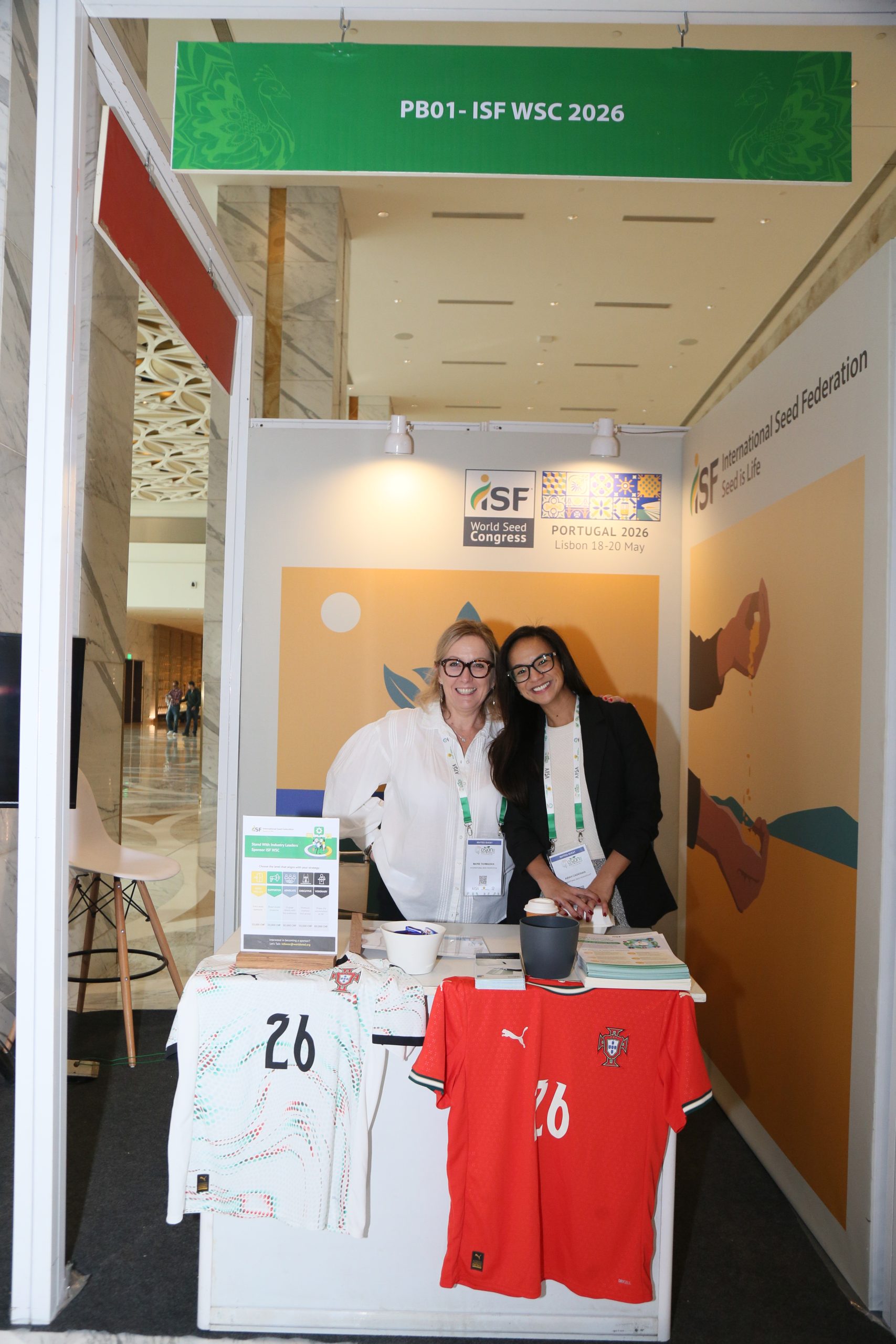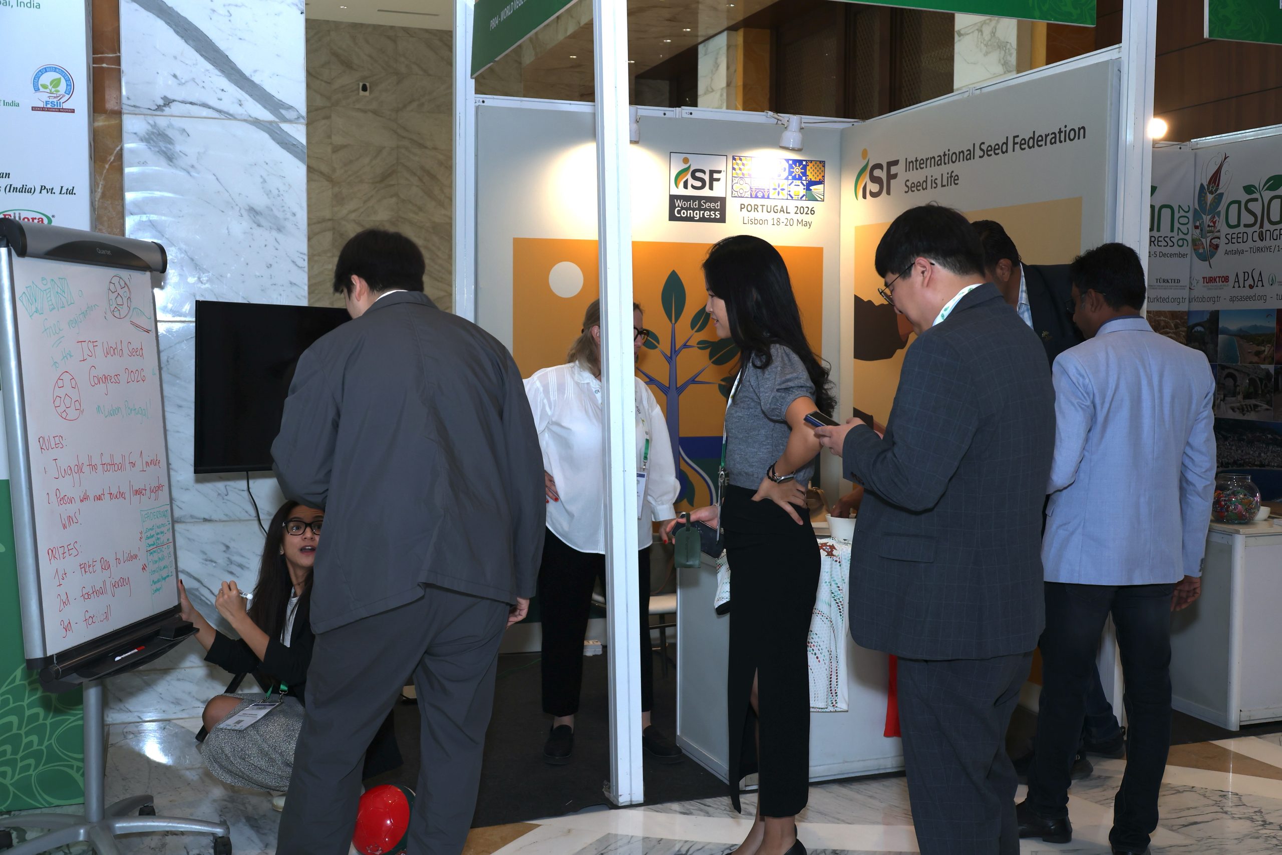 On the exhibition floor, Marie Tahmazian, ISF Members Engagement Manager, and Airah Cadiogan, ISF Communications Manager, promoted the ISF World Seed Congress 2026, to be held in Lisbon, Portugal, on 18-20 May. ISF hosted a booth where a football juggling competition was all the rage among delegates.